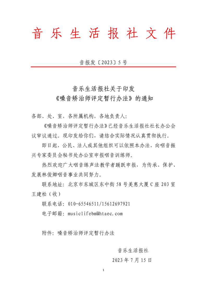 音樂(lè)生活報(bào)社關(guān)于印發(fā)《嗓音矯治師評(píng)定暫行辦法》的通知